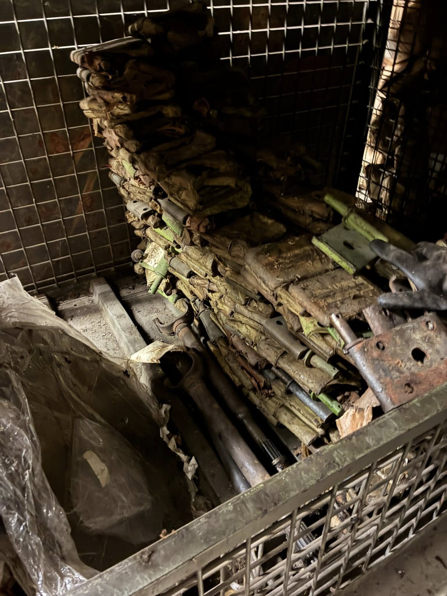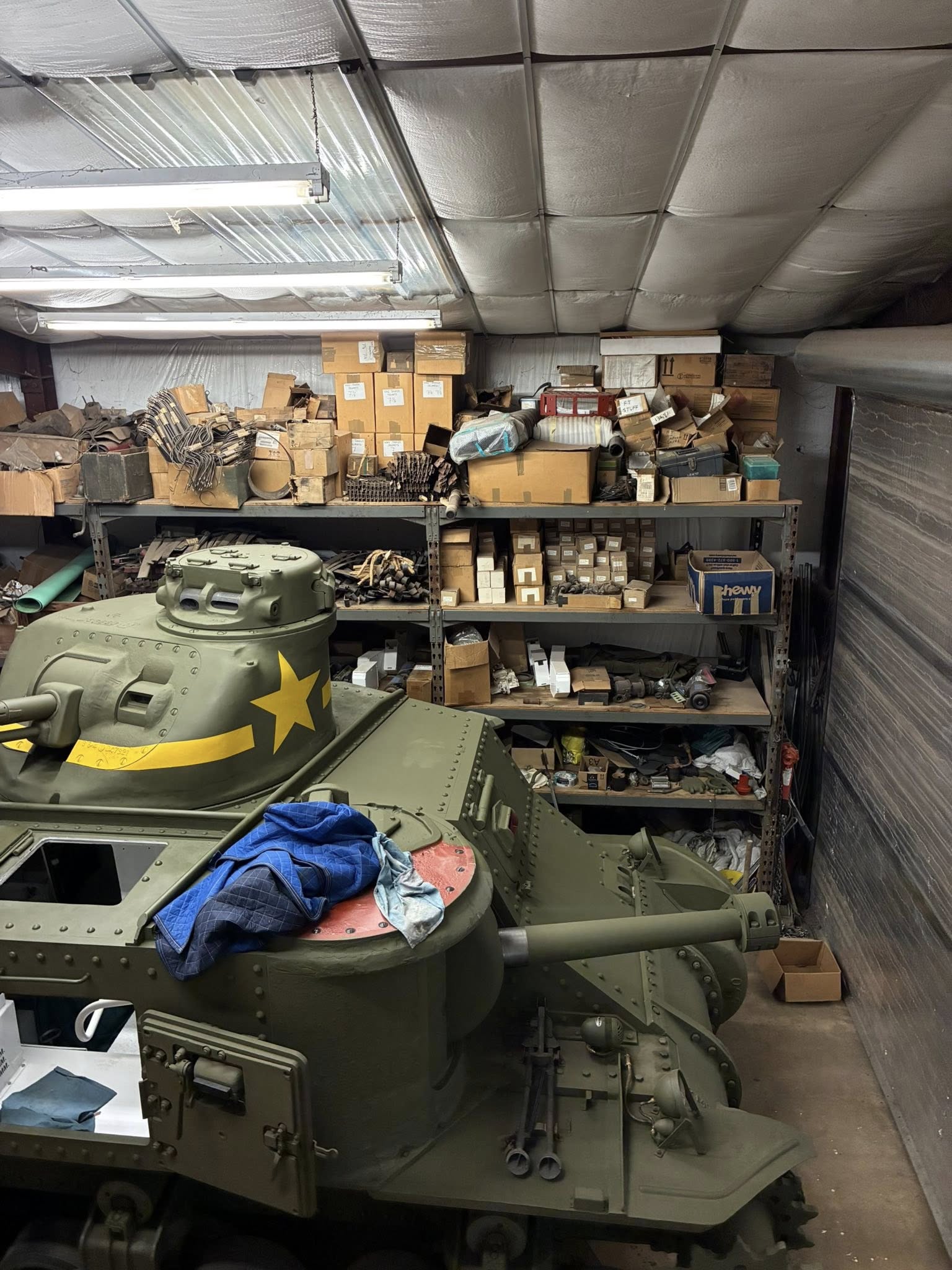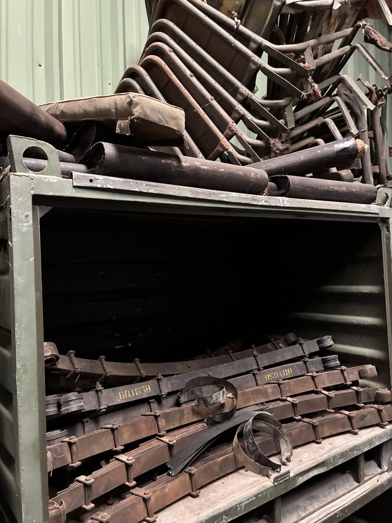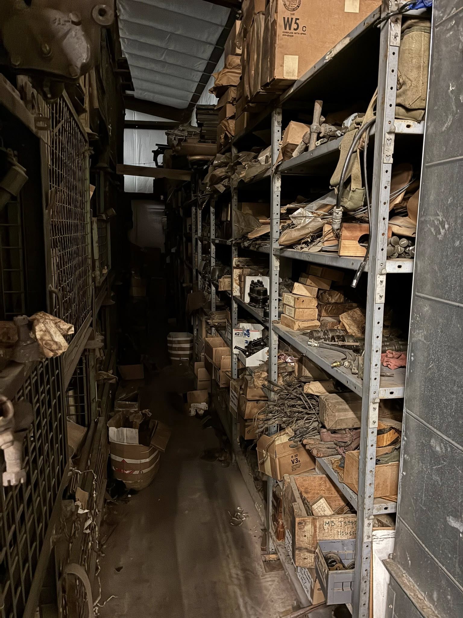 Walk aisles filled with MB, M38, M38A1 Jeep parts, Dodge M37 & WC, and armored vehicle parts representing over 40 years of collecting.